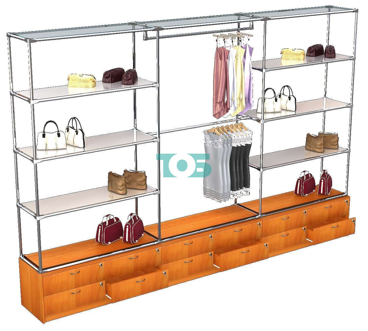 Отличия модели торговой системы ХРОМ без ДСП 3600 мм с тумбами Т14, зеркальными полками и поручнями №1:
