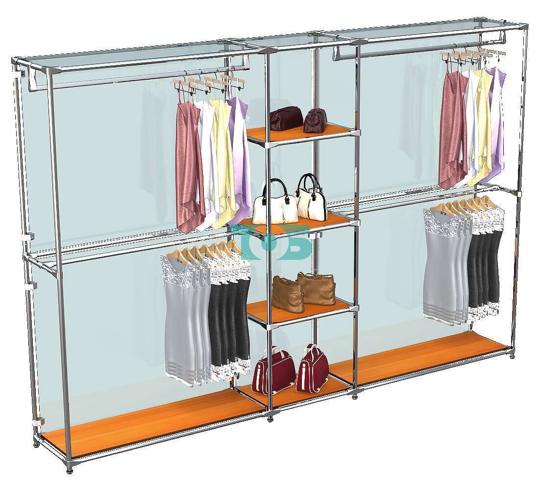 Отличия модели торговой системы ХРОМ (задняя стенка - стекло) 3030 мм с полками ДСП и поручнями №4:
