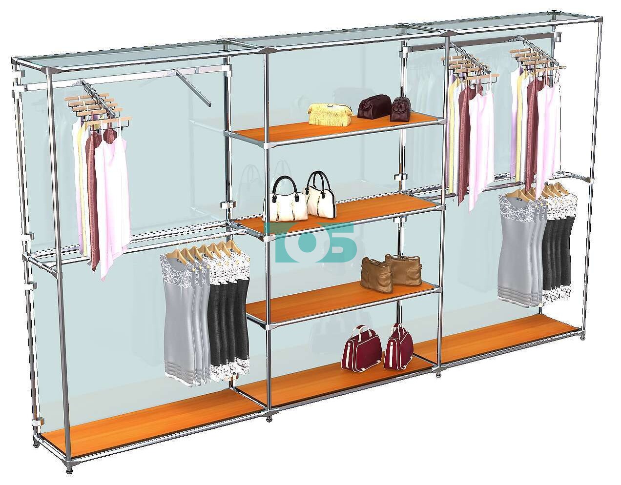 Отличия модели торговой системы ХРОМ (задняя стенка - стекло) 3600 мм с полками ДСП и поручнями №10: