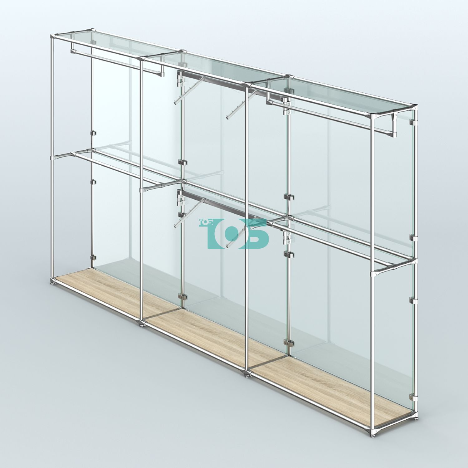 Торговая система ХРОМ с задней стенкой из стекла и поручнями №5 представляет собой универсальное и стильное решение для организации пространства в торговых залах, офисах и других помещениях. Благодаря своей функциональности и качественным материалам система обеспечивает удобство использования и эстетически привлекательный вид.
