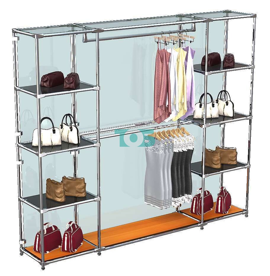 Отличия модели торговой системы ХРОМ (задняя стенка - стекло) 2430 мм с тонированными полками и поручнями №3: