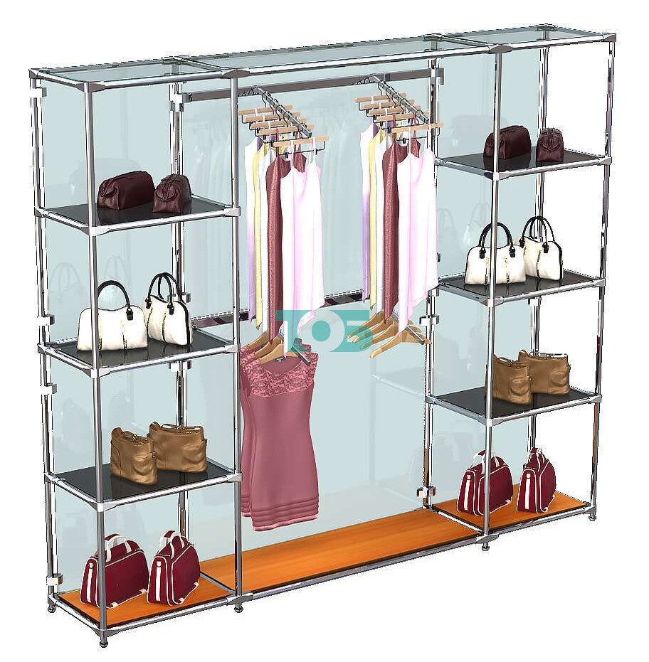 Отличия модели торговой системы ХРОМ (задняя стенка - стекло) 2430 мм с тонированными полками и поручнями №7: