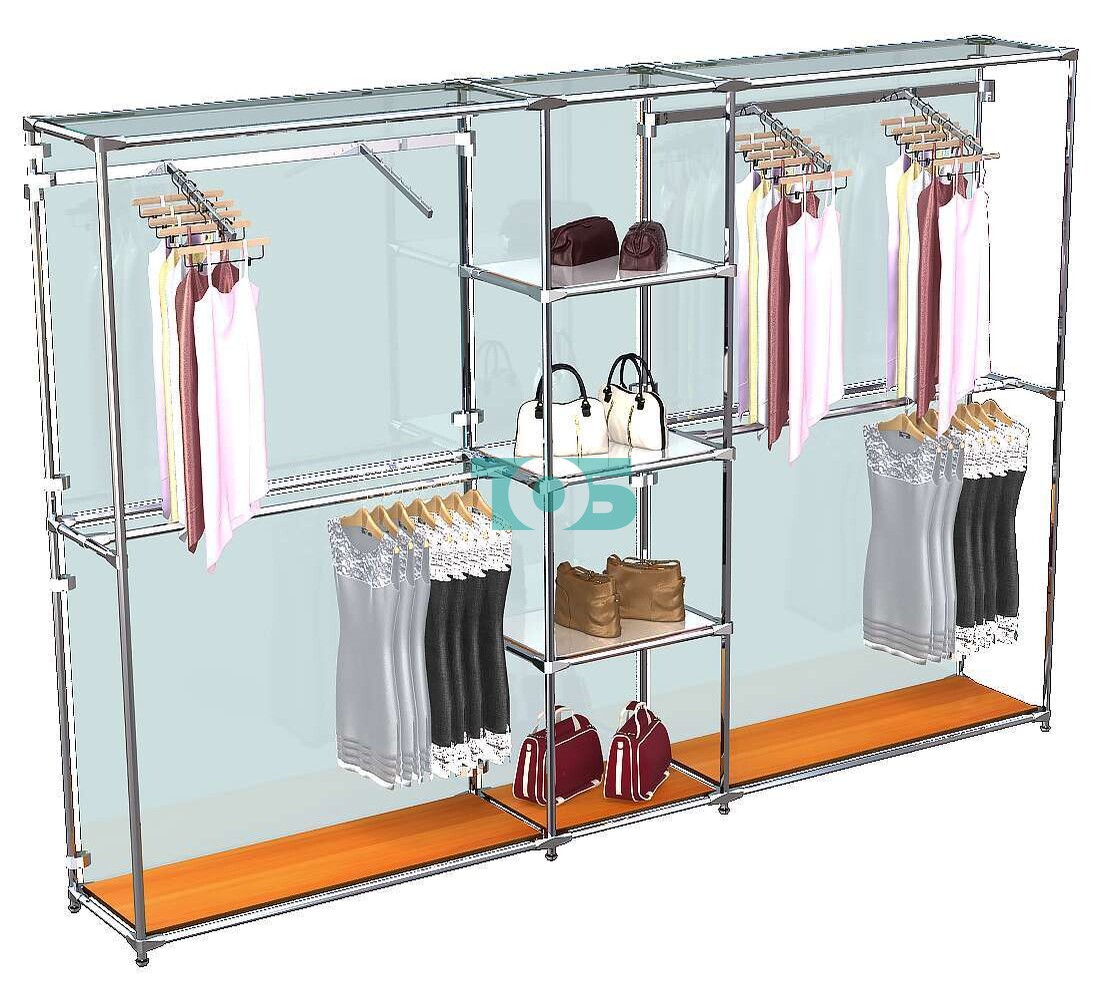 Отличия модели торговой системы ХРОМ (задняя стенка - стекло) 3600 мм с зеркальными полками и поручнями №12: