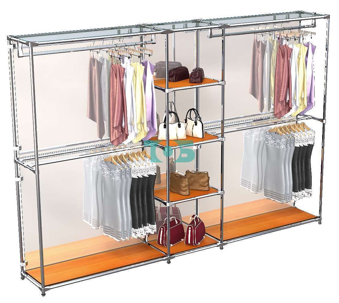 Отличия модели торговой системы ХРОМ (задняя стенка - зеркало) 3030 мм с полками ДСП и поручнями №4:
