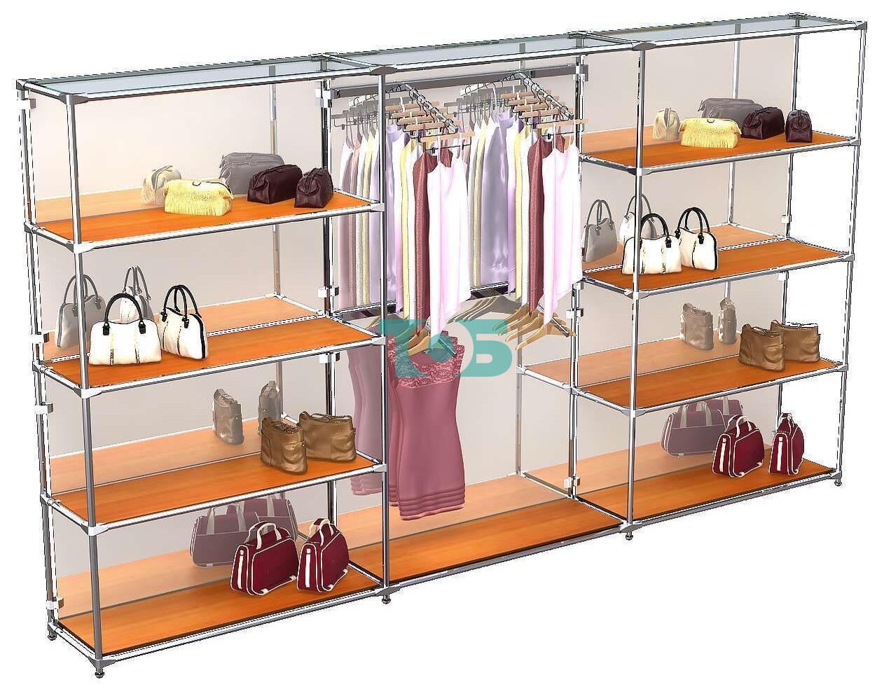 Отличия модели торговой системы ХРОМ (задняя стенка - зеркало) 3600 мм с полками ДСП и поручнями №6: