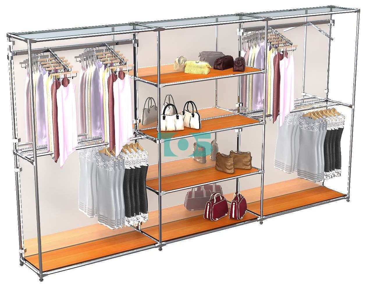 Отличия модели торговой системы ХРОМ (задняя стенка - зеркало) 3600 мм с полками ДСП и поручнями №10: