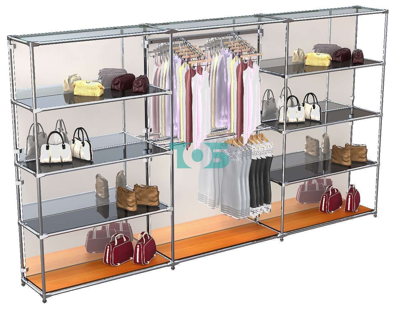 Отличия модели торговой системы ХРОМ (задняя стенка - зеркало) 3600 мм с тонированными полками и поручнями №9: