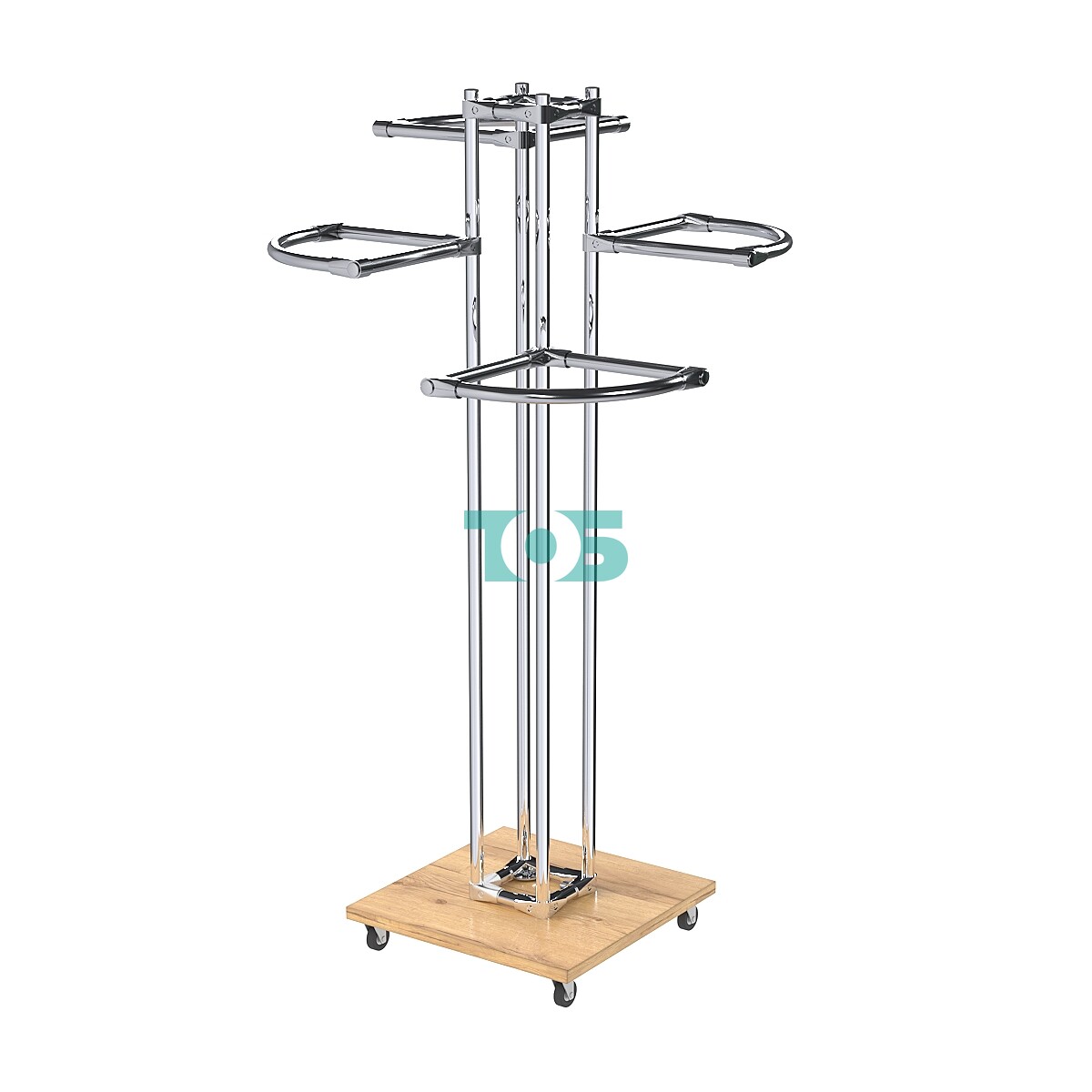 Мобильность: Металлические колеса позволяют легко перемещать вешало по торговому пространству, оптимизируя выкладку товаров.