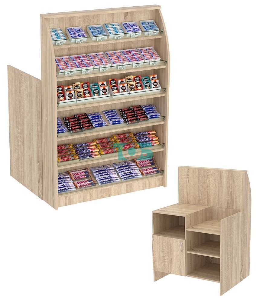 - кассовый прилавок включает в себя весь функционал, необходимый для работы продавца - место для выдачи товара, отсеки для кассы и дополнительного оборудования и узкий приставной модуль с наклонными полками;