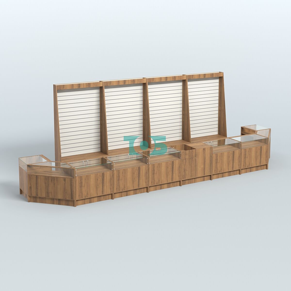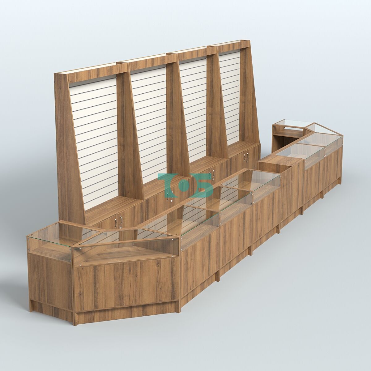 Стеллажи: за спиной продавца стоят стеллажи с экономпанелью высотой 2400 мм, что позволяет эффективно использовать вертикальное пространство для размещения товаров.