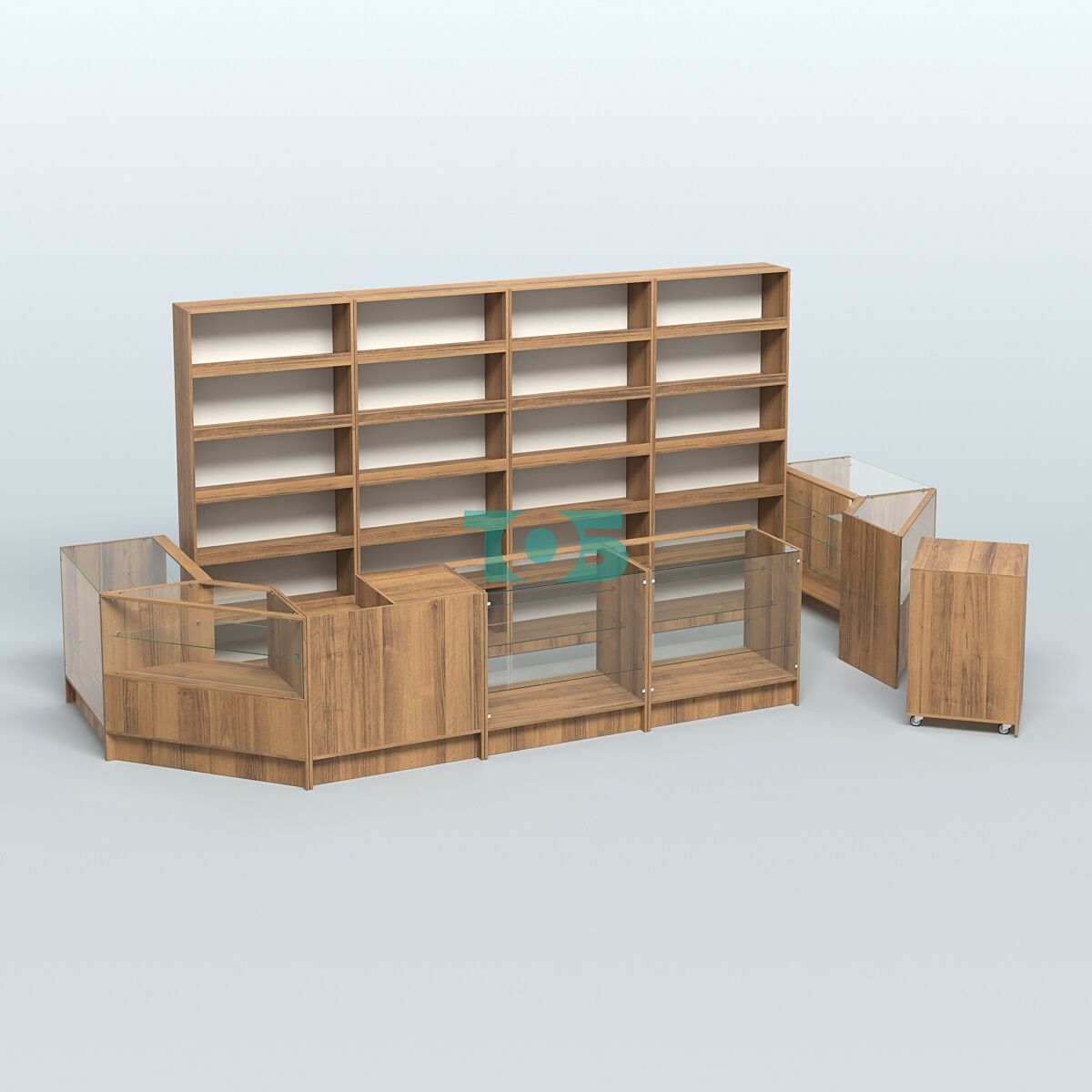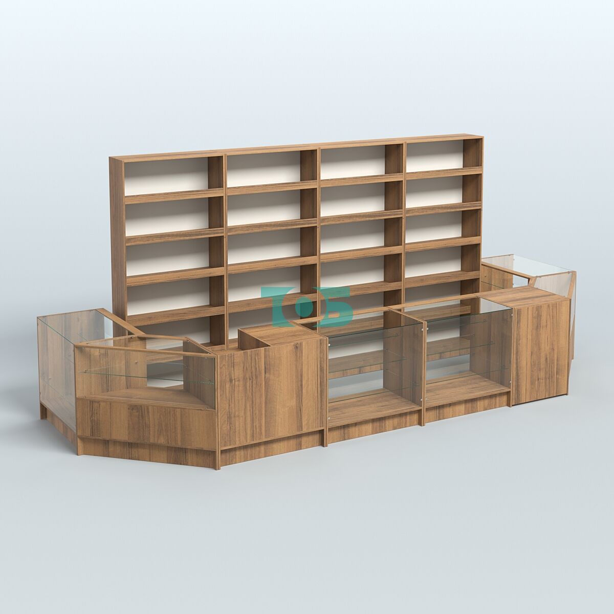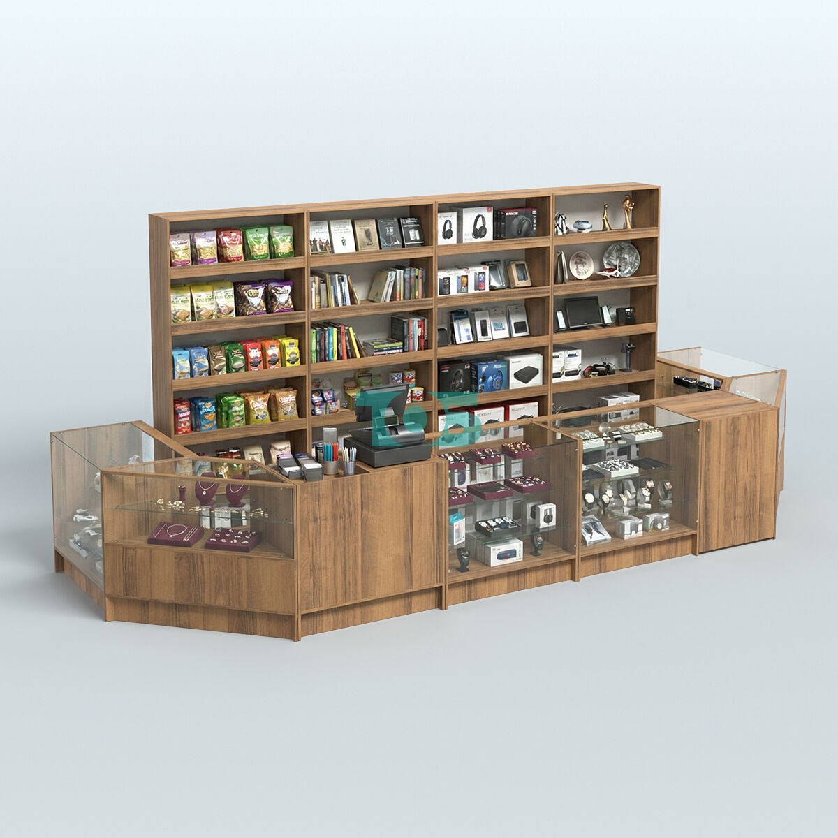 Стеллажи: за спиной продавца стоят стеллажи высотой 2100 мм, что позволяет эффективно использовать вертикальное пространство для размещения товаров.