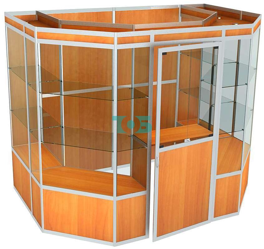 - Откидная крышка из ДСП 16мм под кассу, также имеются стеклянные дверки в распашной двери павильона, используемые в качестве окна выдачи.