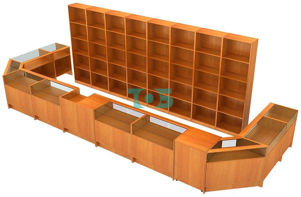 • Стеллажи: за спиной продавца стоят стеллажи высотой 2100 мм, что позволяет эффективно использовать вертикальное пространство для размещения товаров.