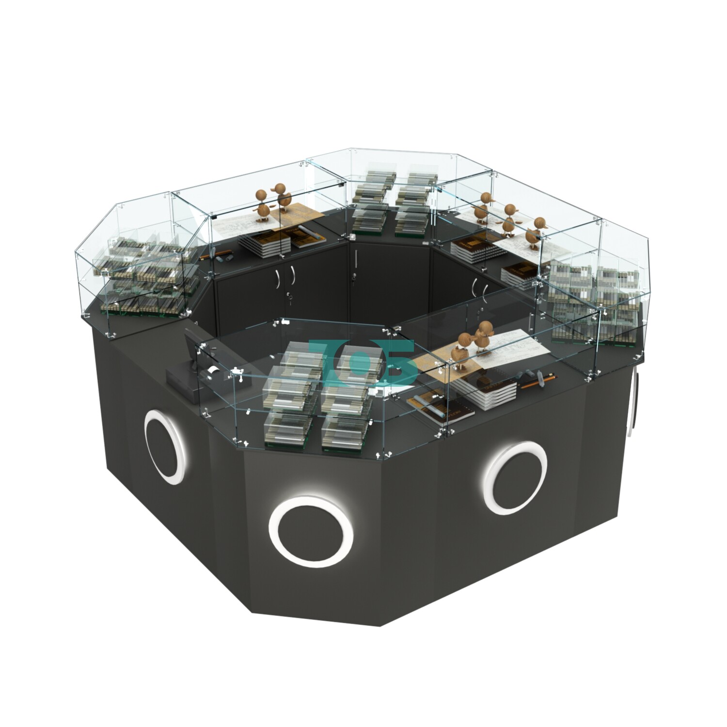 - островок павильон состоит из четырёх шестиугольных и трёх прямоугольных стеклянных прилавков;