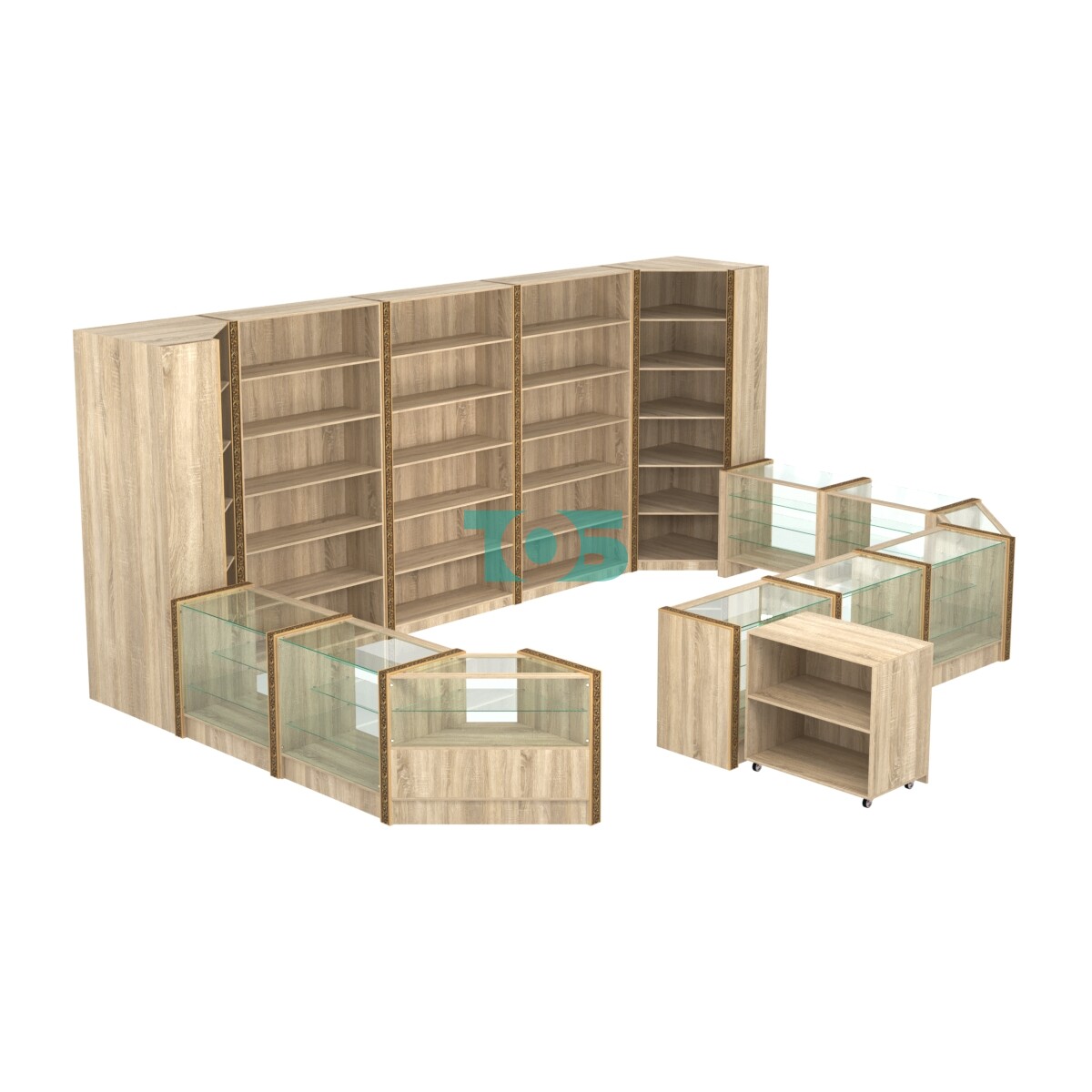 - три прямоугольных модуля с прозрачными фасадами и тремя разными по глубине полками для демонстрации Товара;