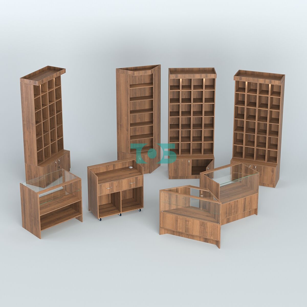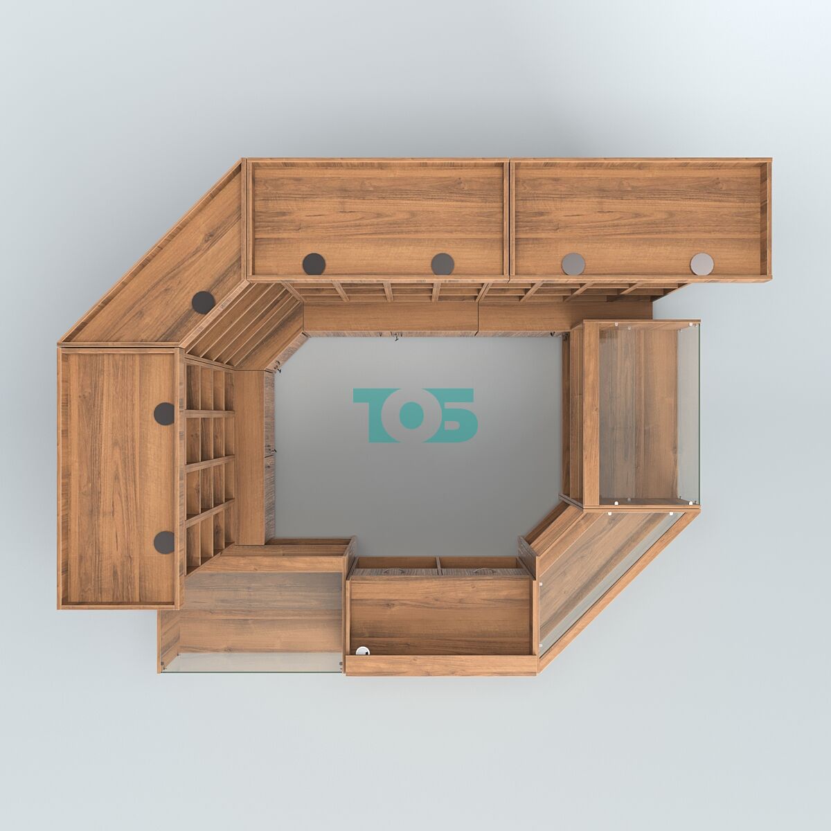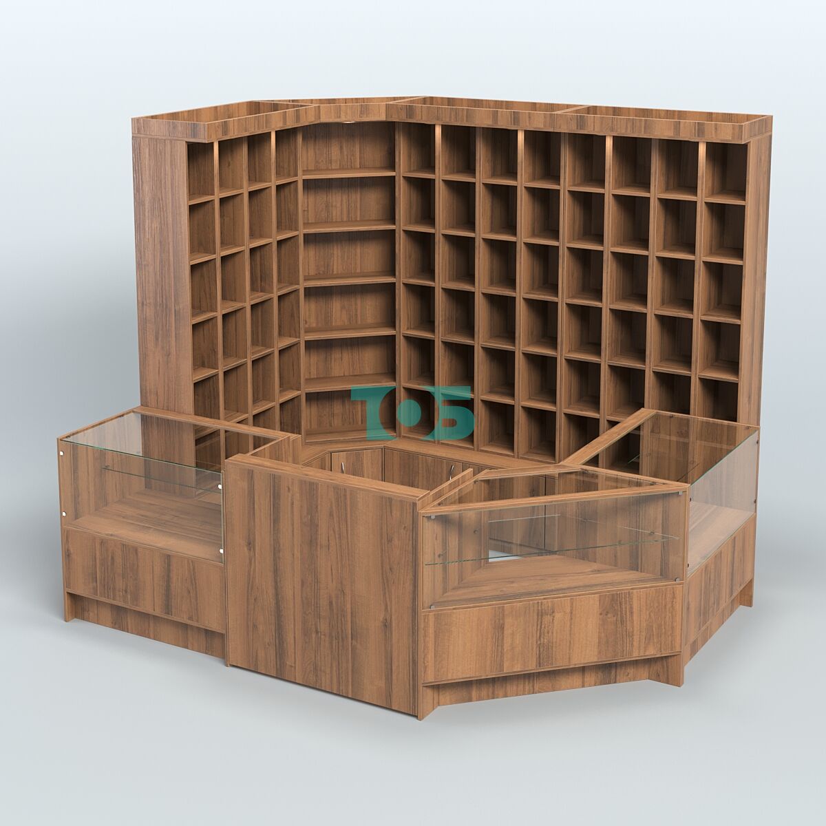 - Павильон имеет прямоугольную форму, Состоит из трех прямых стеллажей, 1-го углового, 2 прямых прилавков, 1-го скошенного, и прилавка кассира.