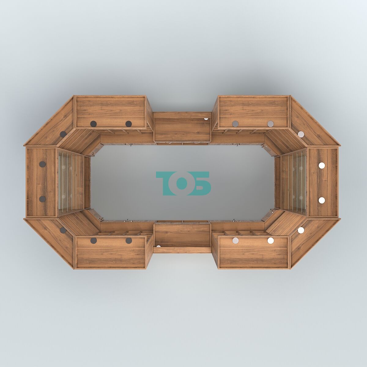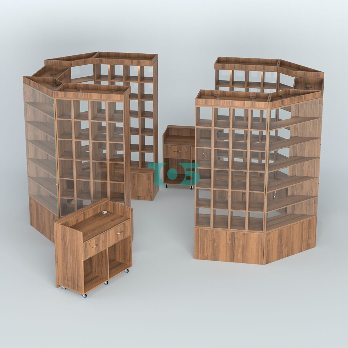 - Павильон имеет прямоугольную форму, Состоит из 4 прямых стеллажей, 4 угловых стеллажей, 2 высоких витрин, 2 прилавков кассира.