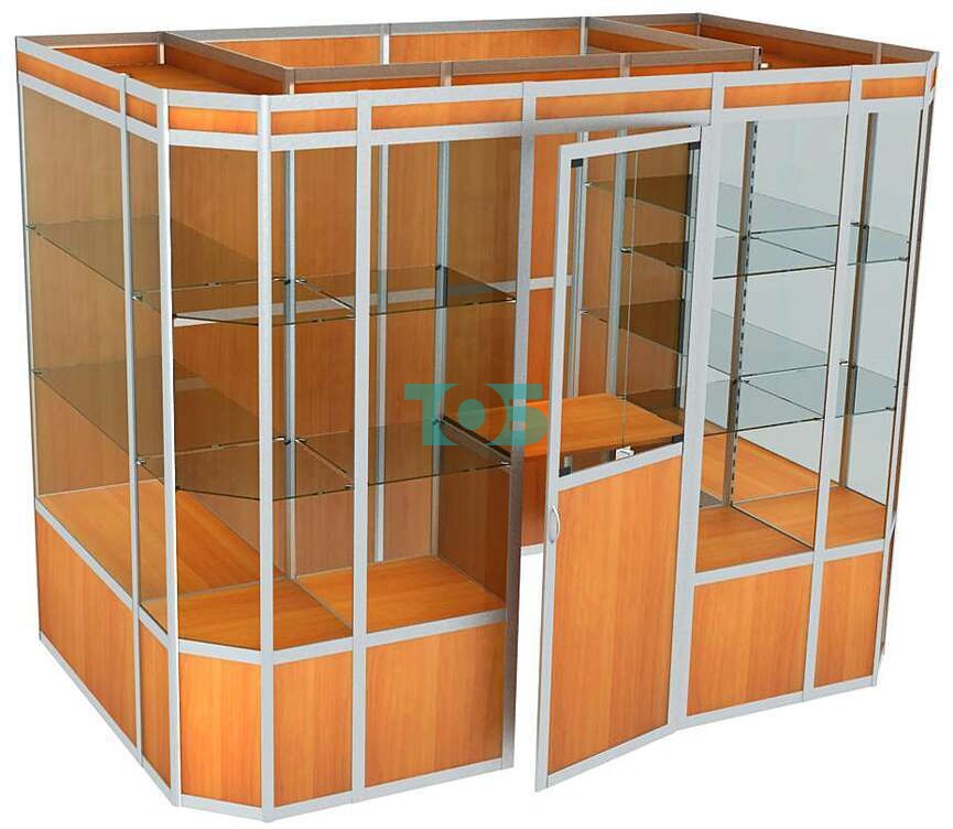 Форма: прямоугольная с скошенными правым и левым углами и глухая задняя стенка, что придаёт павильону уникальный внешний вид.