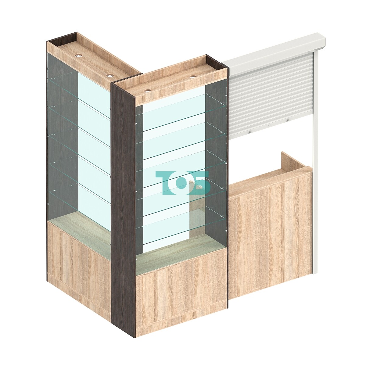 Угловой павильон «ДУБ ВЕНГЕ + ДУБ СОНОМА» №-5П представляет собой компактное торговое пространство площадью 2,16 кв. м, предназначенное для организации продаж в различных торговых точках. Павильон оснащён необходимыми элементами для удобной работы продавца и комфортного обслуживания покупателей.