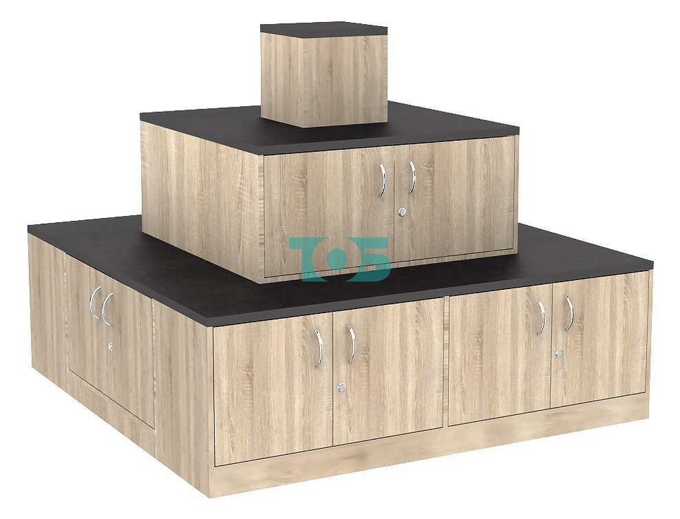 - центральный ярус высотой 400 мм и размером 900 х 900 мм предусматривает внутреннее пространство для складирования товара, разделенное на две части с дверками и замками, расположенными по двум симметричным сторонам;