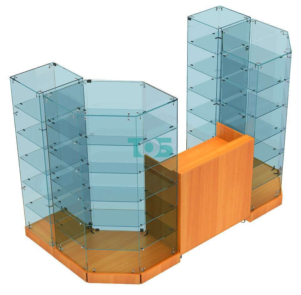 Полки: в павильоне предусмотрено по пять стеклянных полок на каждой стороне, расстояние между полками составляет 246 мм, что позволяет удобно разместить товары.