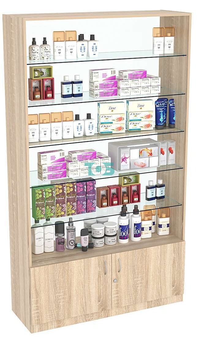 Задняя стенка: задняя стенка витрины выполнена из прозрачного стекла, что придаёт конструкции лёгкость и позволяет клиентам рассмотреть товары со всех сторон.