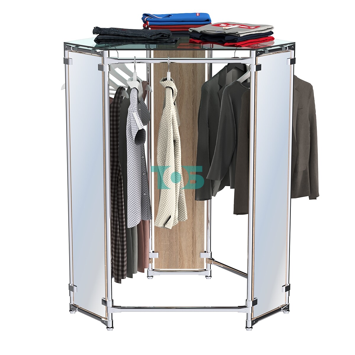 Продольные поручни по трем длинным сторонам: Идеально подходят для демонстрации одежды, облегчая ее размещение и просмотр.