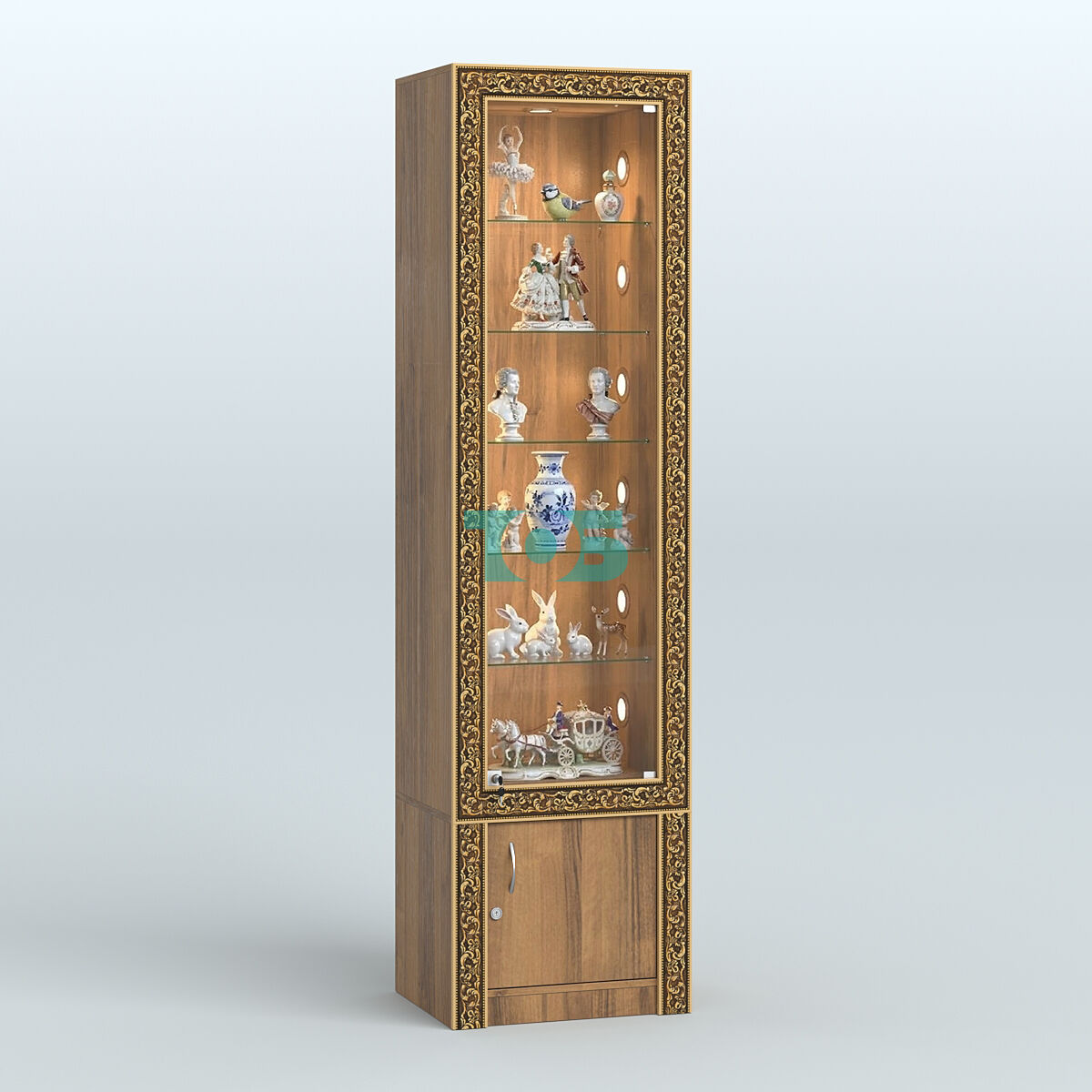 - серия витрин у которых фасадная часть декорированная цветными молдингами под золото. Эти элементы подчеркивают четкость линий, что помогает вписать витрину в интерьер любого стиля;