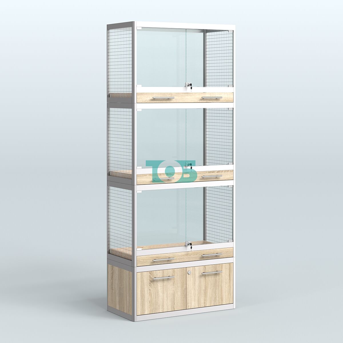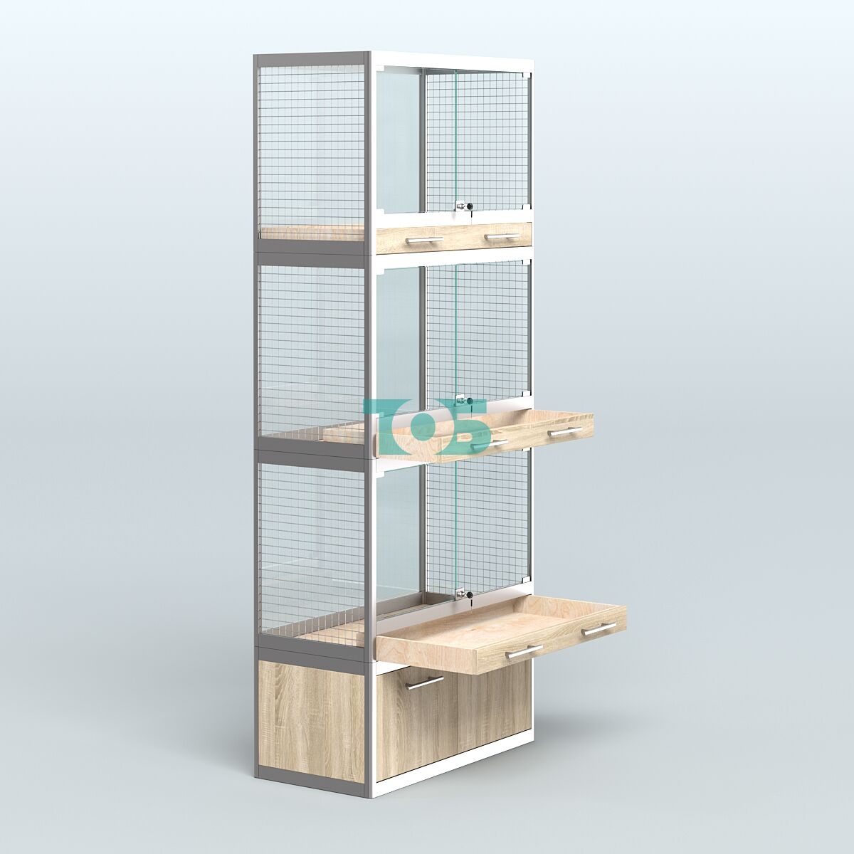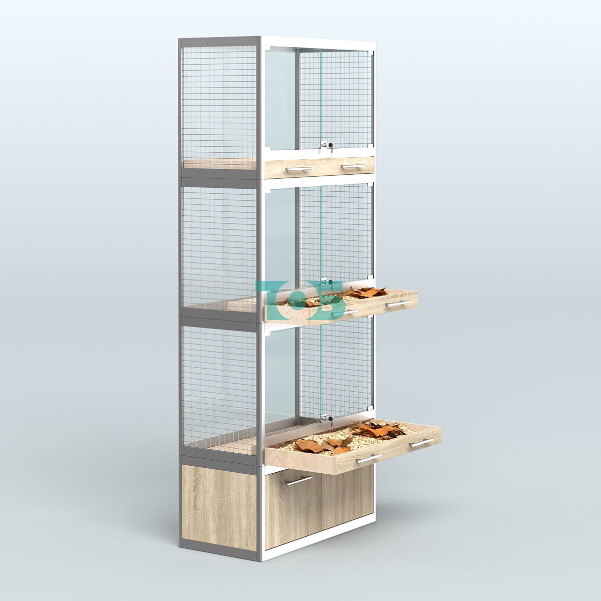 - специализированная витрина в Зоо магазин предназначена для продажи средних млекопитающих таких как: хорьков, куниц и соболей. Торцы витрины укомплектованы сеткой. В каждом отсеке внешние стеклянные дверки с замком и одним большим выдвижным ящиком для сбора опилок и помета;