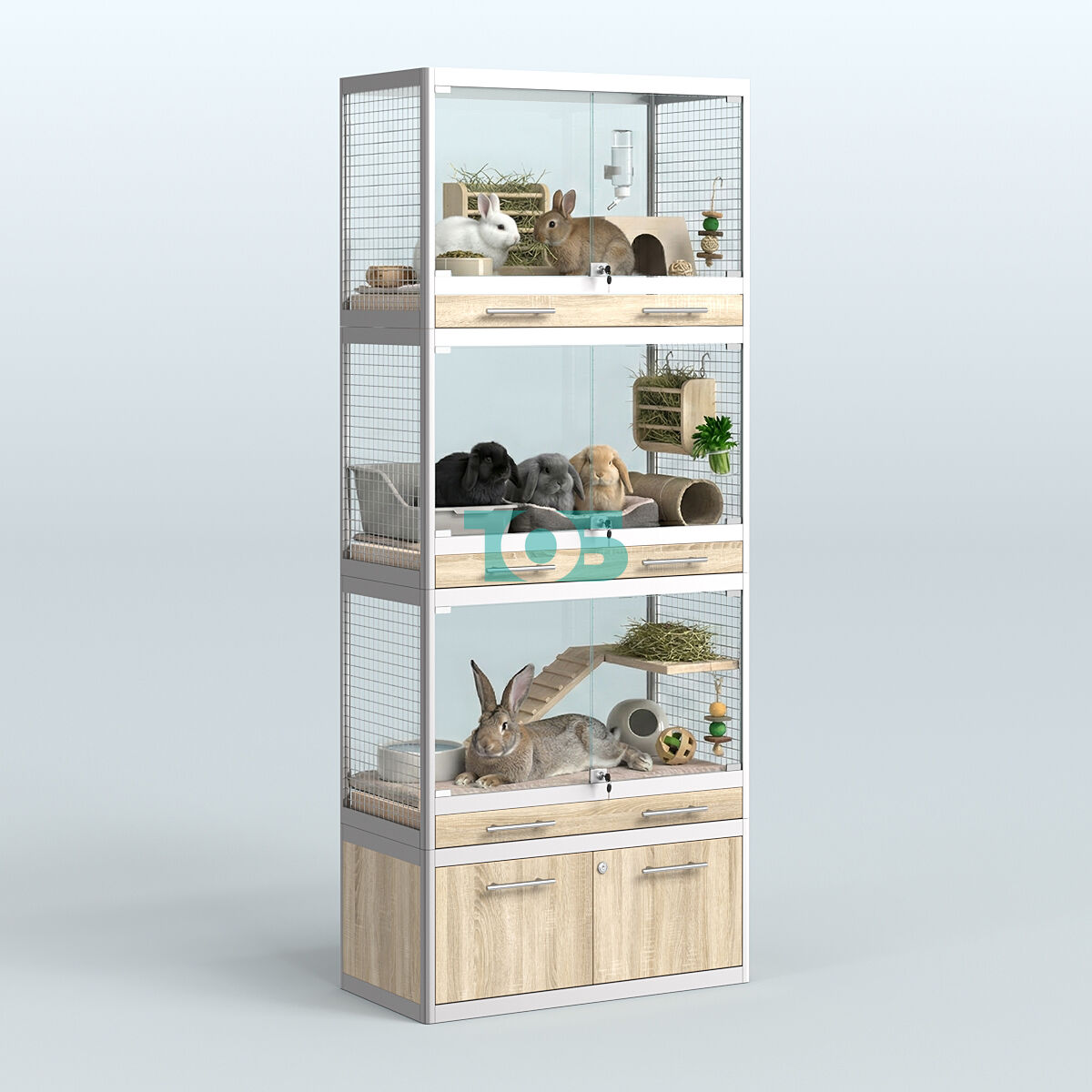 - каждый отсек для животного укомплектован: торцами из сетки, внешними стеклянными дверками с замком и одним выдвижным ящиком из фанеры для сбора опилок и помета;