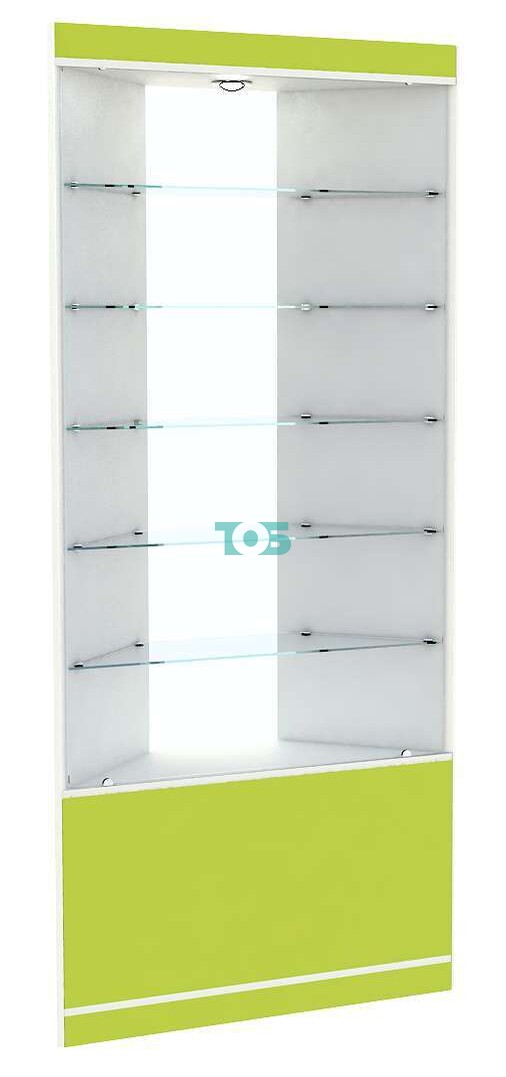 Отличия модели витрины из ДСП внешнего угла для аптеки первой линии ЛАЙМ-05: