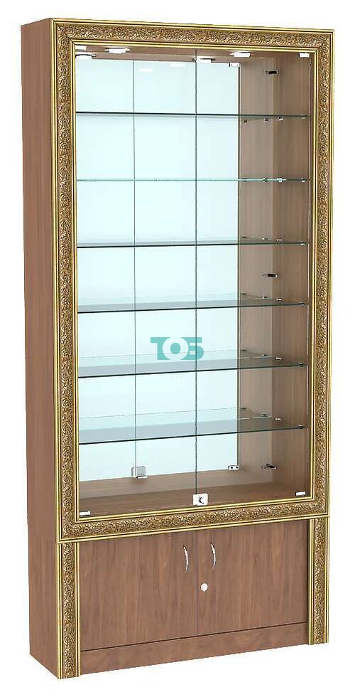 - серия витрин у которых фасадная часть декорированная цветными молдингами под золото. Эти элементы подчеркивают четкость линий, что помогает вписать витрину в интерьер любого стиля;