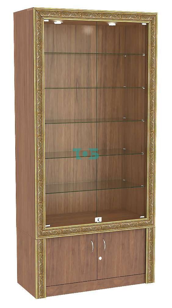 - серия витрин у которых фасадная часть декорированная цветными молдингами под золото. Эти элементы подчеркивают четкость линий, что помогает вписать витрину в интерьер любого стиля;
