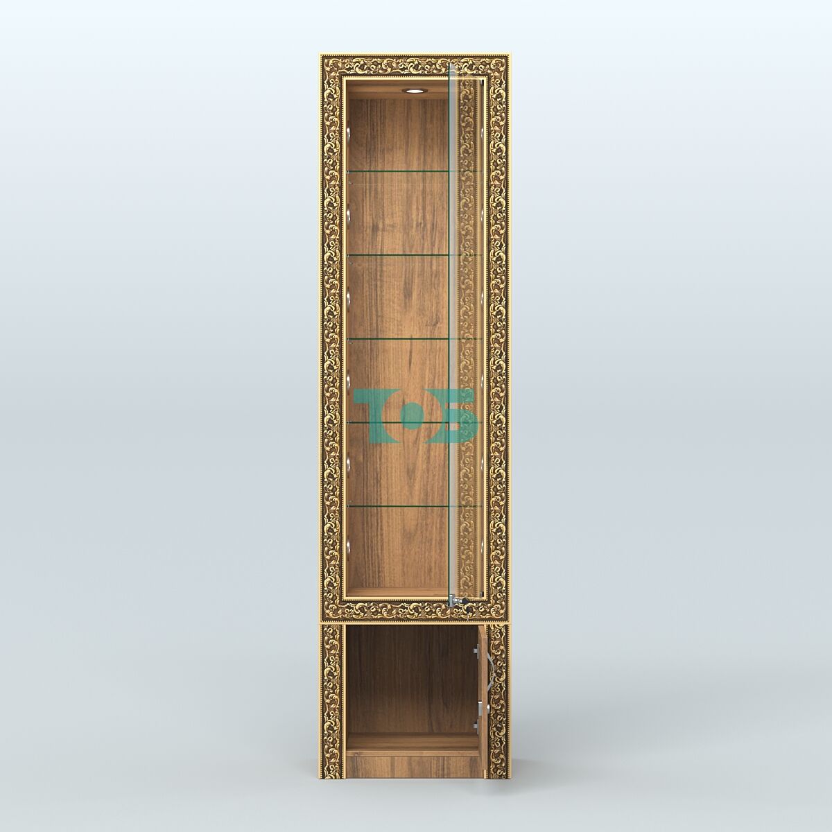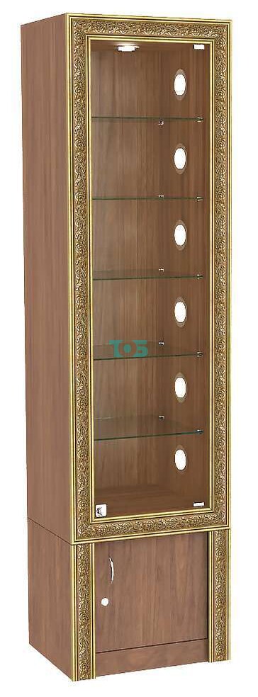 - серия витрин у которых фасадная часть декорированная цветными молдингами под золото. Эти элементы подчеркивают четкость линий, что помогает вписать витрину в интерьер любого стиля;