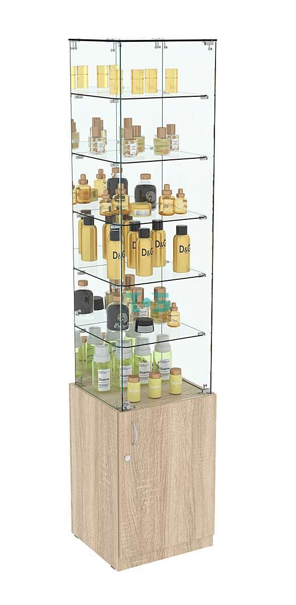 • Распашная стеклянная дверь с замком: Расположена в зеркальной части витрины, обеспечивая удобный доступ к товарам.