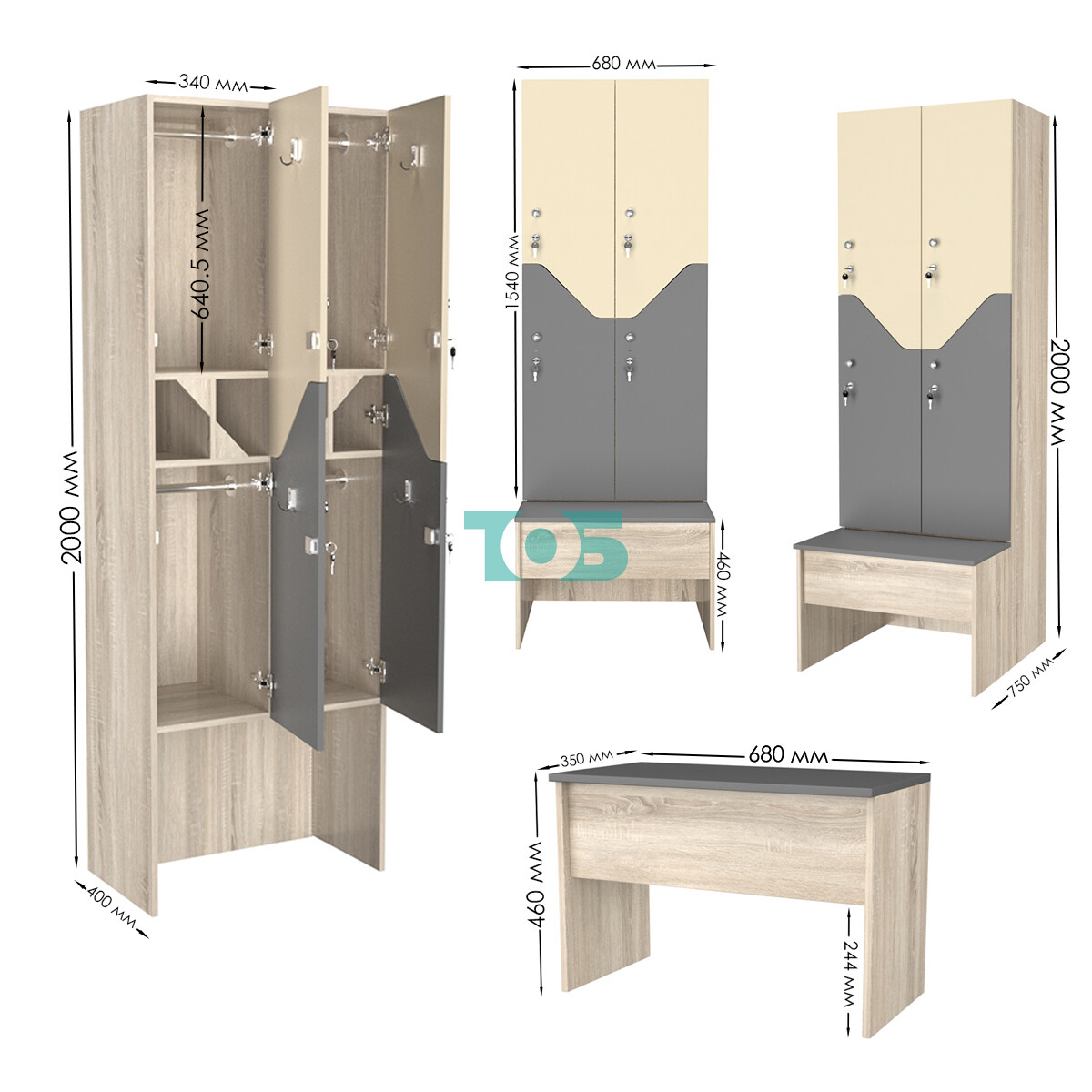 Габариты: глубина шкафа составляет 400 мм, а глубина скамейки — 350 мм. Такие размеры позволяют оптимально использовать пространство и обеспечивают удобство при использовании.