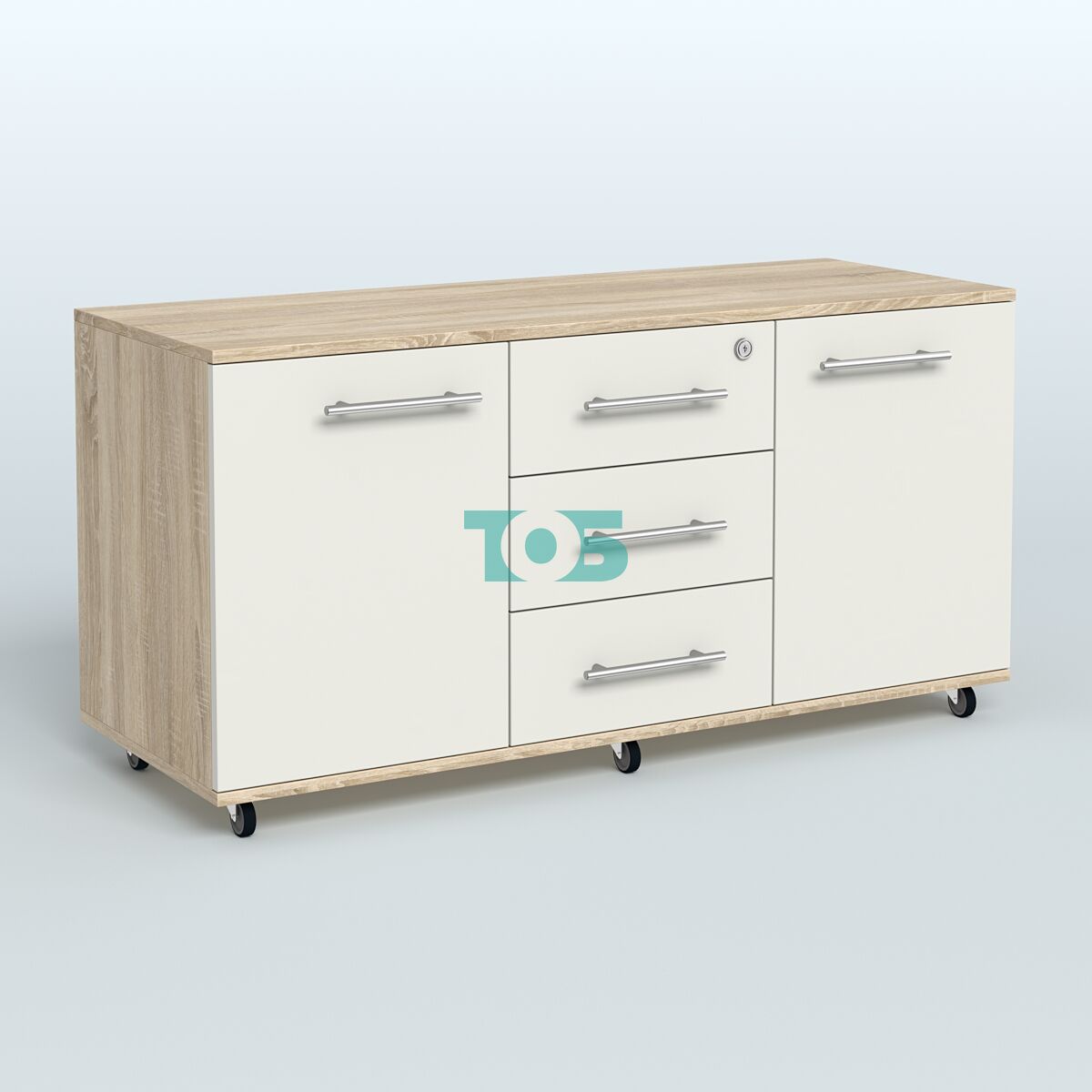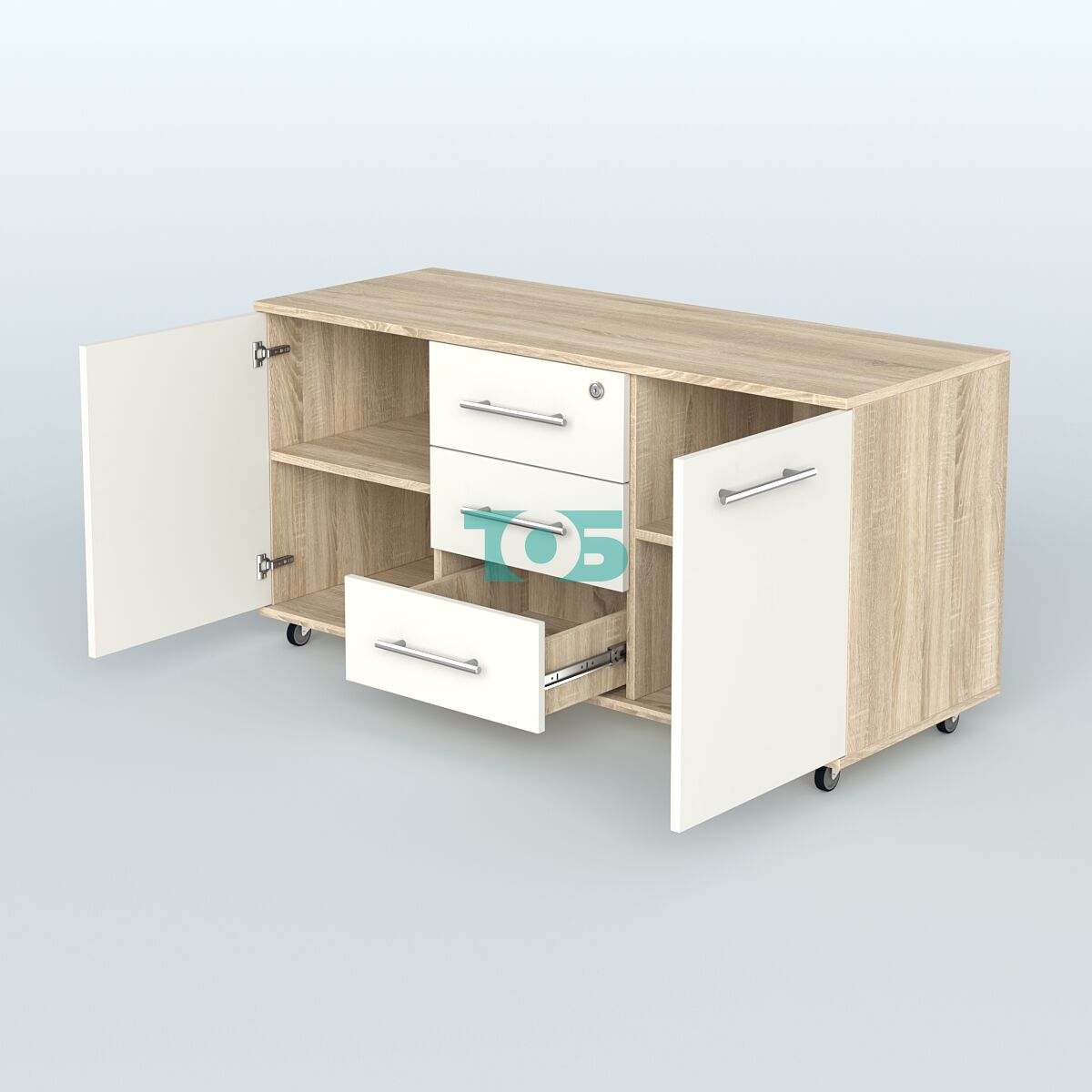 Тумба приставная с 3 ящиками (метабокс) и нишей с замком без топа Индиго Вуд, цвет белый + дуб светлый