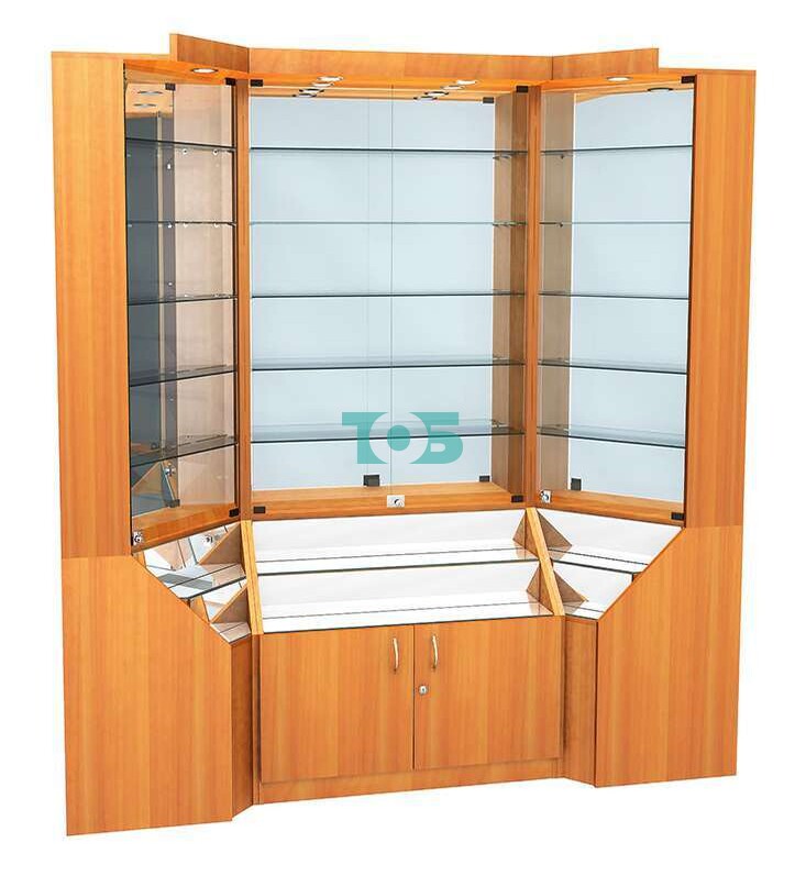 - По 5 стеклянных полок в верхнем блоке витрины, также две полки в нижней части в виде ступеней.