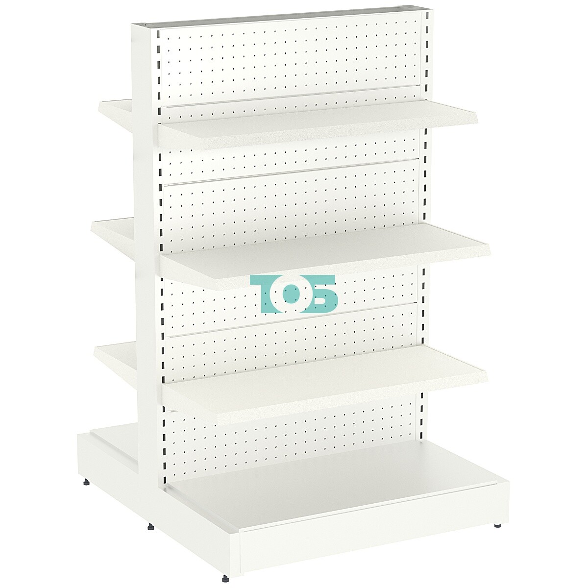 Тип стеллажа: островной. Полки расположены по обеим сторонам, что позволяет использовать стеллаж для хранения предметов с двух сторон.