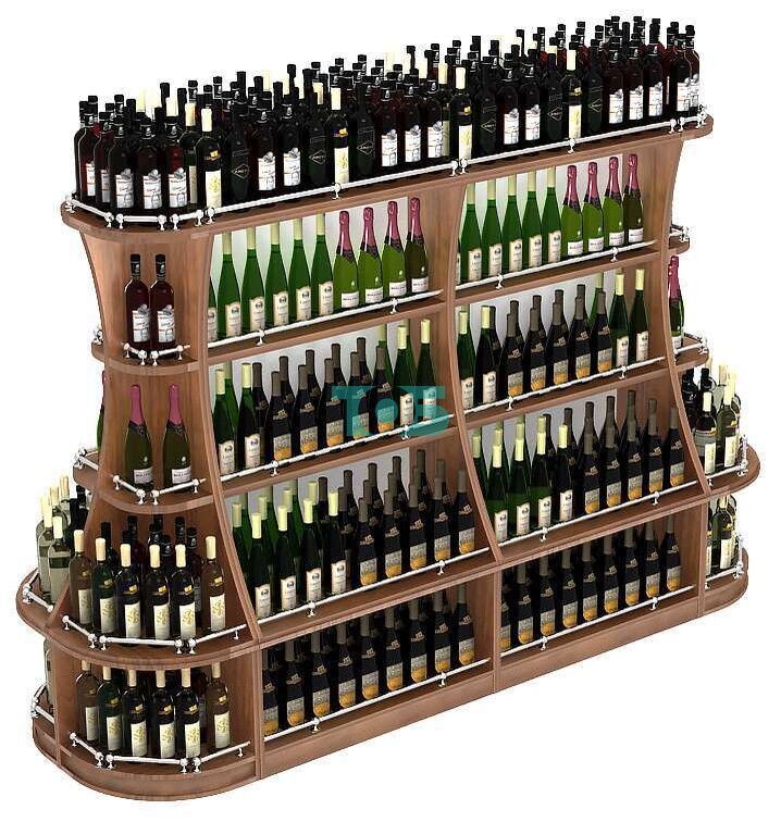 Островной низкий четырех - секционный с закруглениями стеллаж для продажи алкоголя серии ГАРАНТ №2