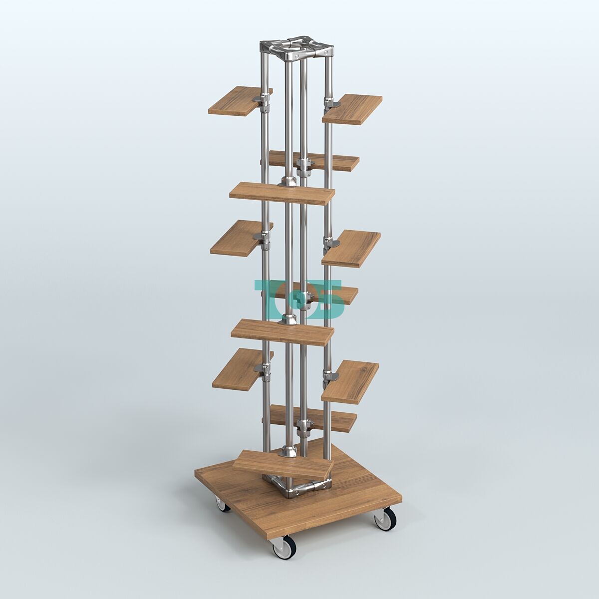 Полки: Двенадцать полок из ДСП толщиной 16 мм, также доступных в различных цветах, что позволяет создавать гармоничный и привлекательный внешний вид стенда.