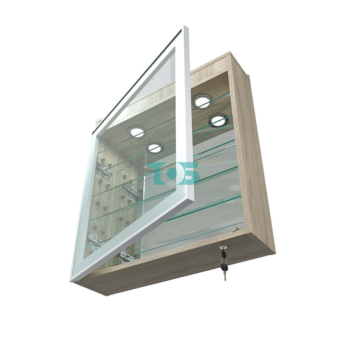 Зеркальная задняя стенка: специальное зеркальное покрытие визуально увеличивает пространство, отражает свет и создаёт эффект глубины, что особенно важно при демонстрации ювелирных изделий, аксессуаров и других ценных предметов.
