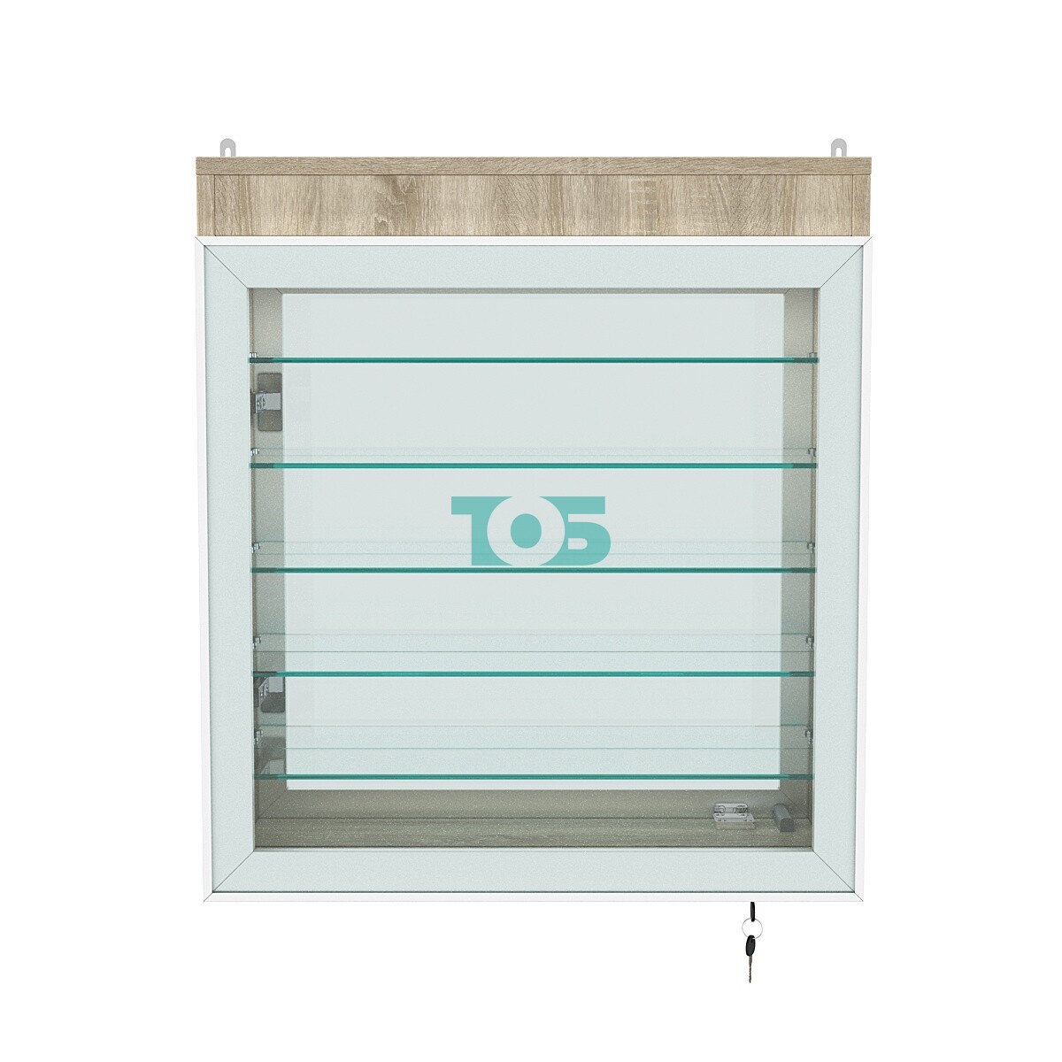 Дверной блок: витрина оборудована двумя распашными дверями из закалённого стекла в алюминиевом профиле, оснащёнными надёжным замковым механизмом для защиты содержимого.
