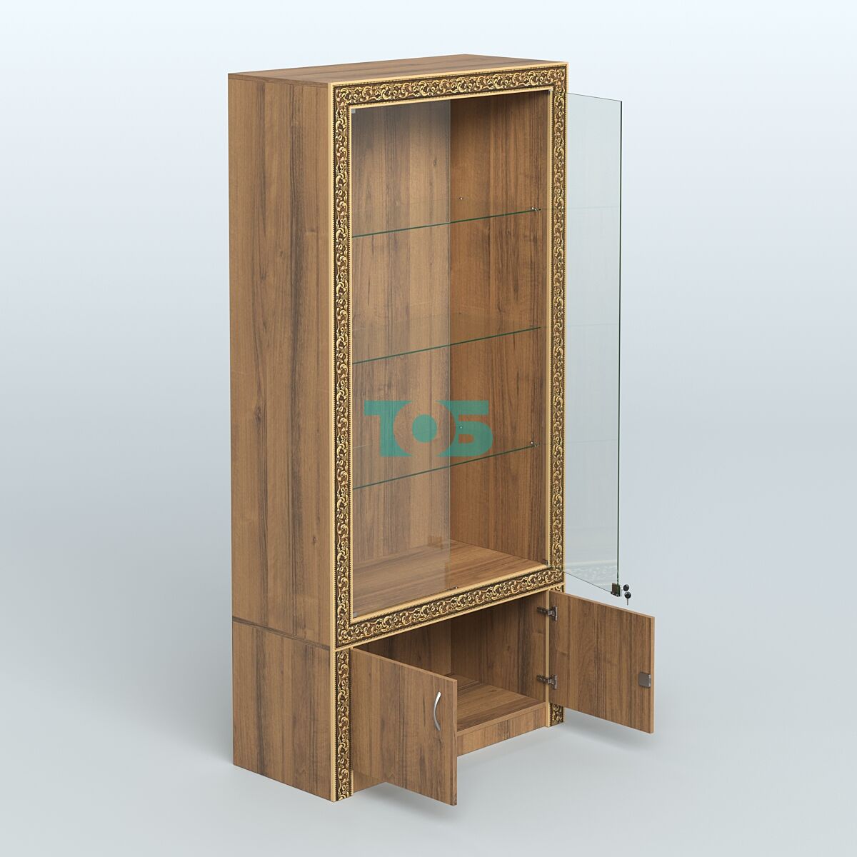 - серия витрин у которых фасадная часть декорированная цветными молдингами под золото. Эти элементы подчеркивают четкость линий, что помогает вписать витрину в интерьер любого стиля;