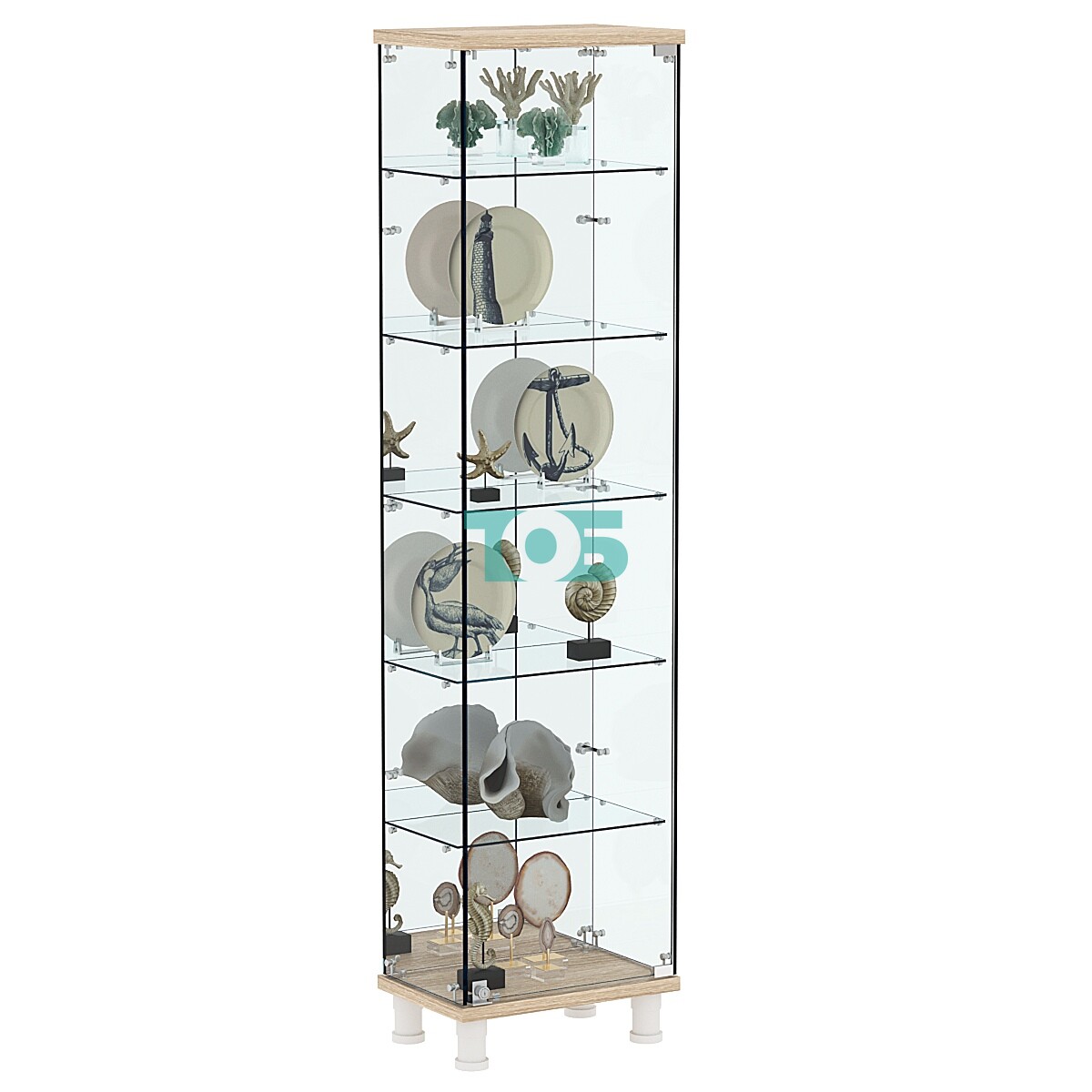 • Стеклянные полки: Внутри витрины размещены пять стеклянных полок, которые обеспечивают стильное и безопасное хранение продукции. Расстояние между полками составляет 275 мм, что позволяет удобно размещать товары различных форматов.