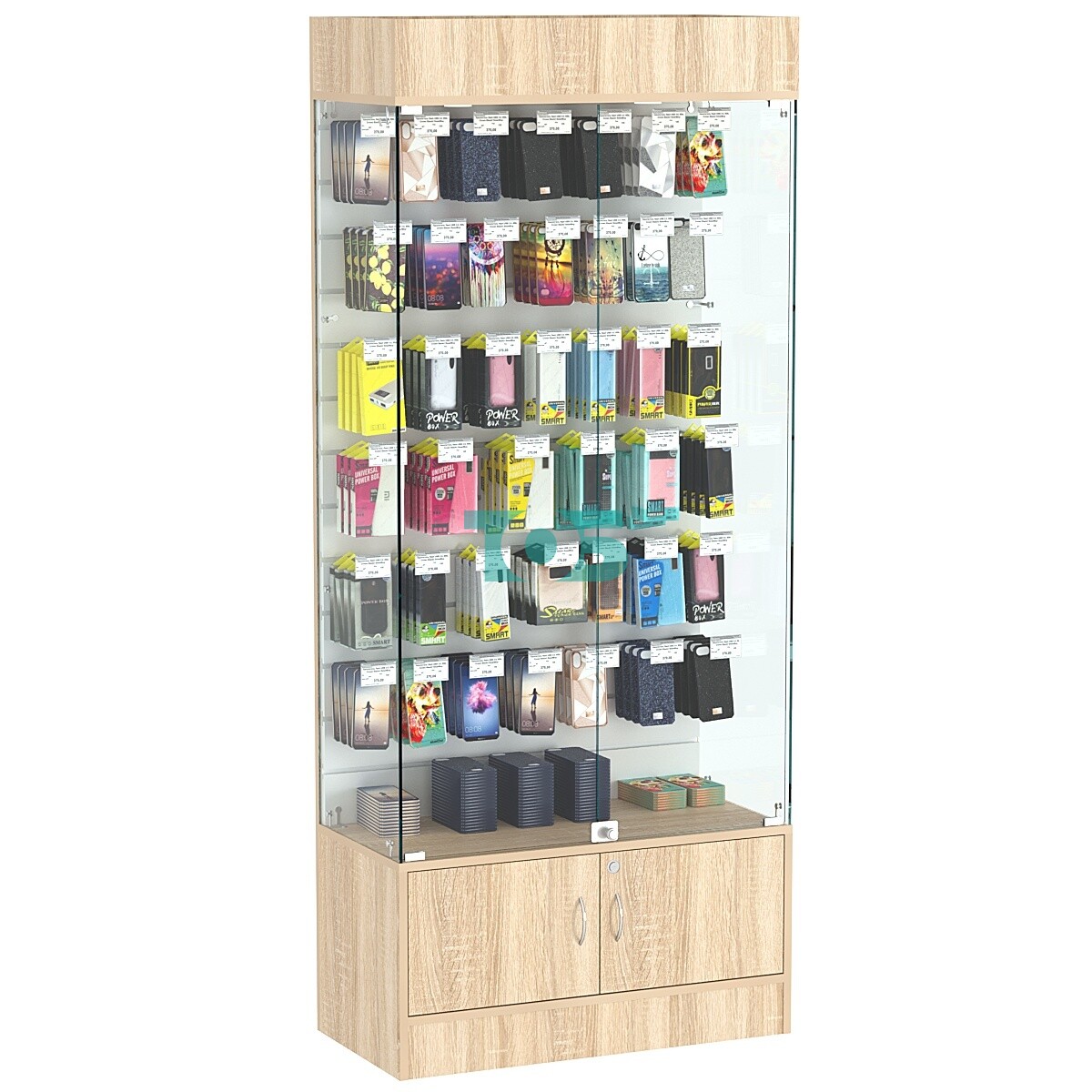 Витрина с эконом-панелью для салона связи №2 предлагает широкий обзор товара и функциональность.