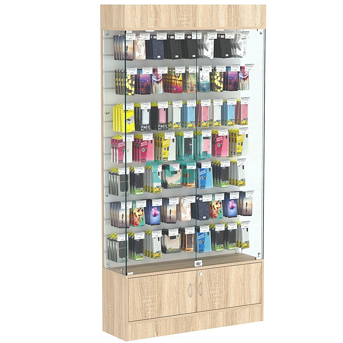 Витрина с эконом-панелью для салона связи №3 предлагает широкий обзор товара и функциональность.