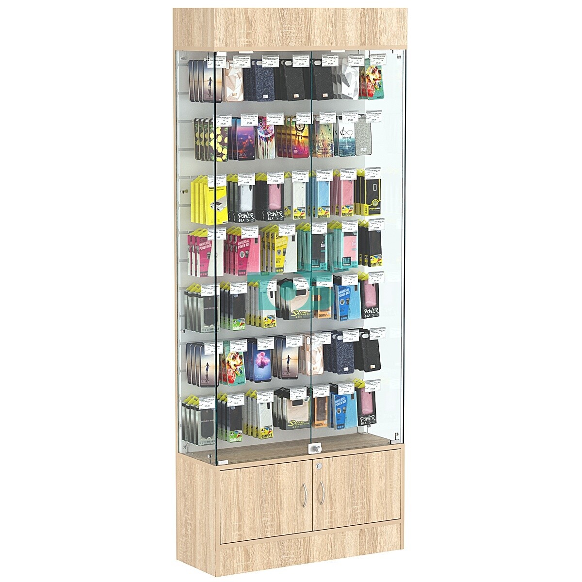 Витрина с эконом-панелью для салона связи №4 предлагает широкий обзор товара и функциональность.