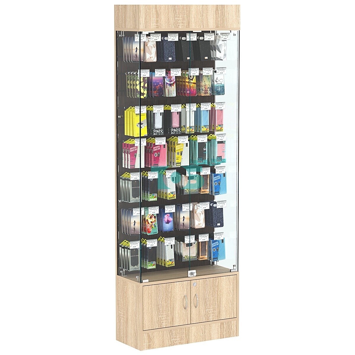 Витрина с эконом-панелью для салона связи №5 предлагает широкий обзор товара и функциональность.