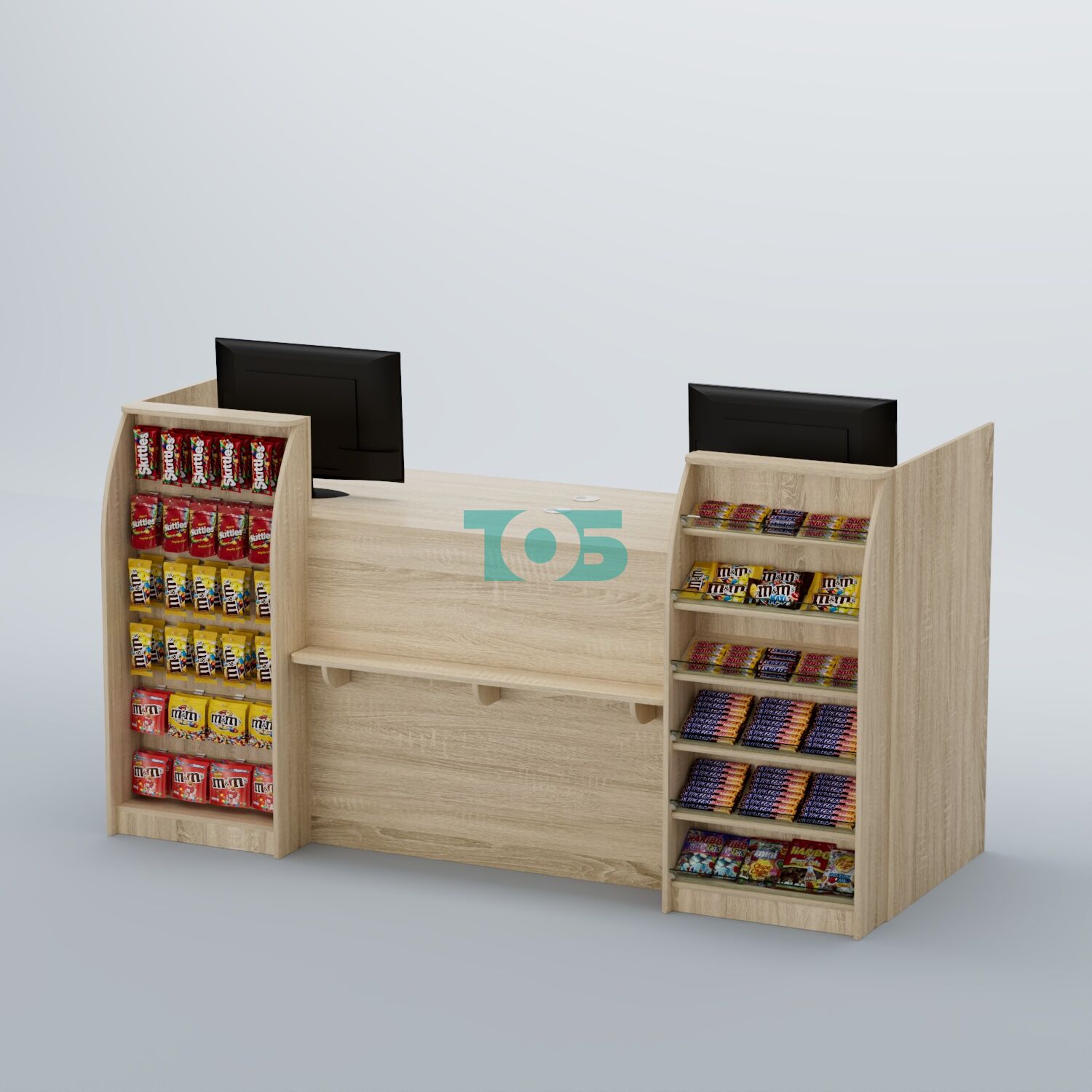 Ресепшен Атлант с фасадными наклонными полочками и экономпанелью №5 представляет собой современную и функциональную модель, разработанную с учетом многолетнего опыта нашей компании и пожеланий клиентов. Эта модель идеально подходит для магазинов одежды, обуви, косметики, парфюмерии, постельного белья и подарков, обеспечивая максимальную функциональность и удобство для двух продавцов.